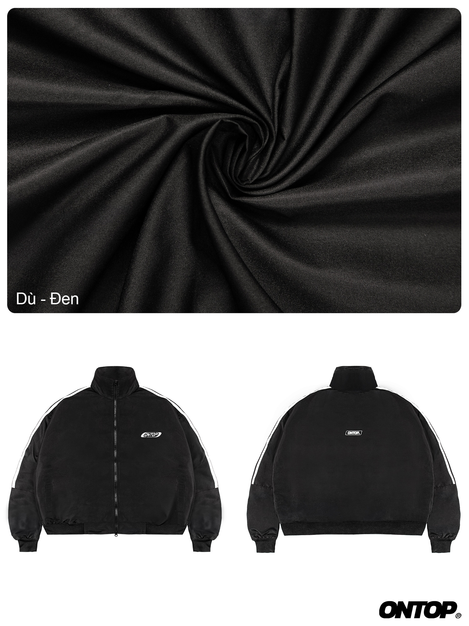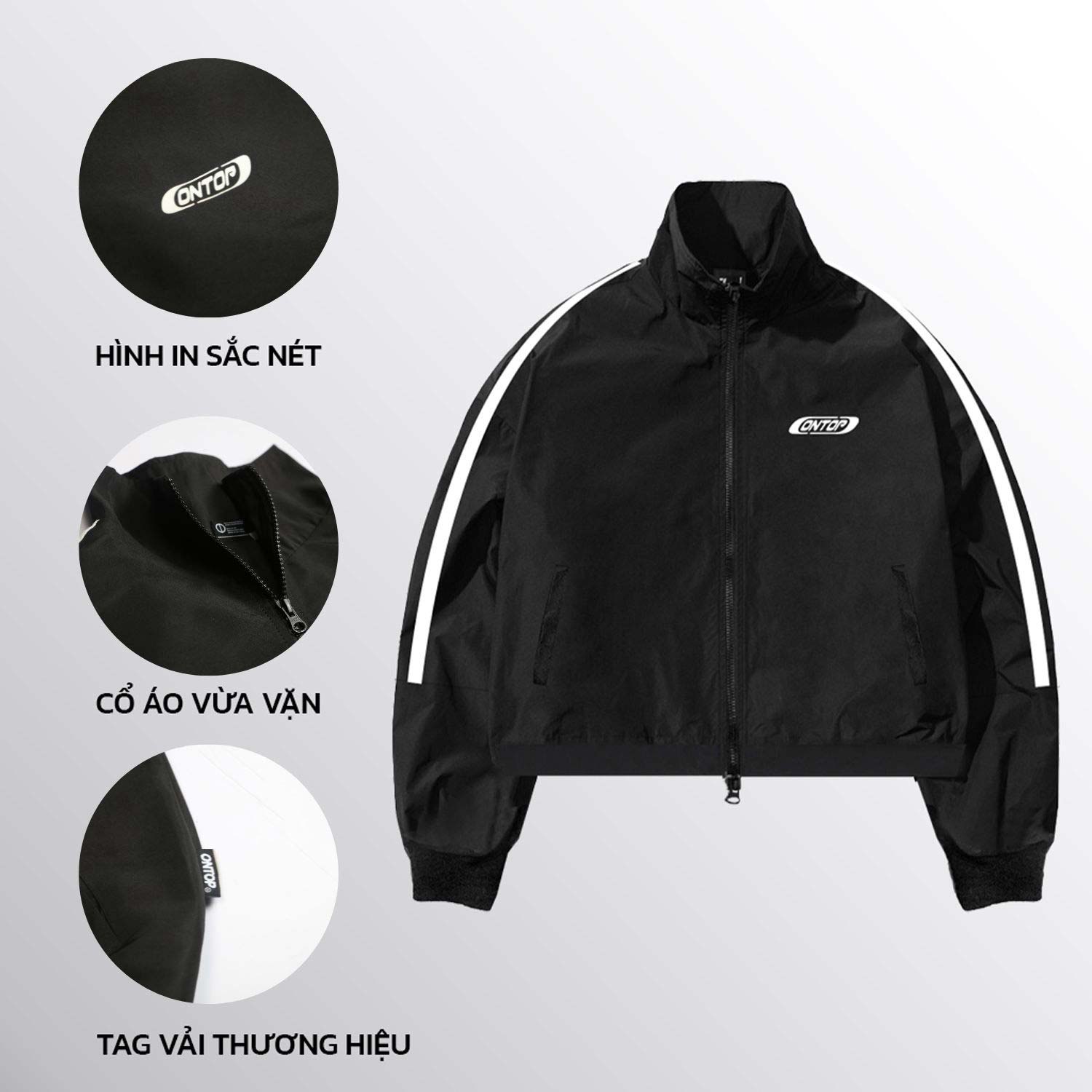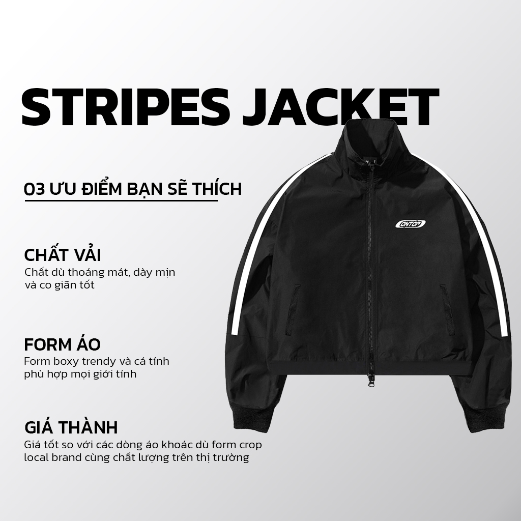 Áo khoác local brand Jacket tripes có thiết kế đơn giản, mang tính ứng dụng cao. Form áo cổ trụ, màu đen được phối với phần tay áo sọc trắng giúp kết hợp, phối đồ dễ dàng với các phụ kiện khác. Phần tay áo có đường cắt để cắt phần sọc. Phần góc trái áo in nổi logo ONTOP tạo điểm nhấn cho sản phẩm.