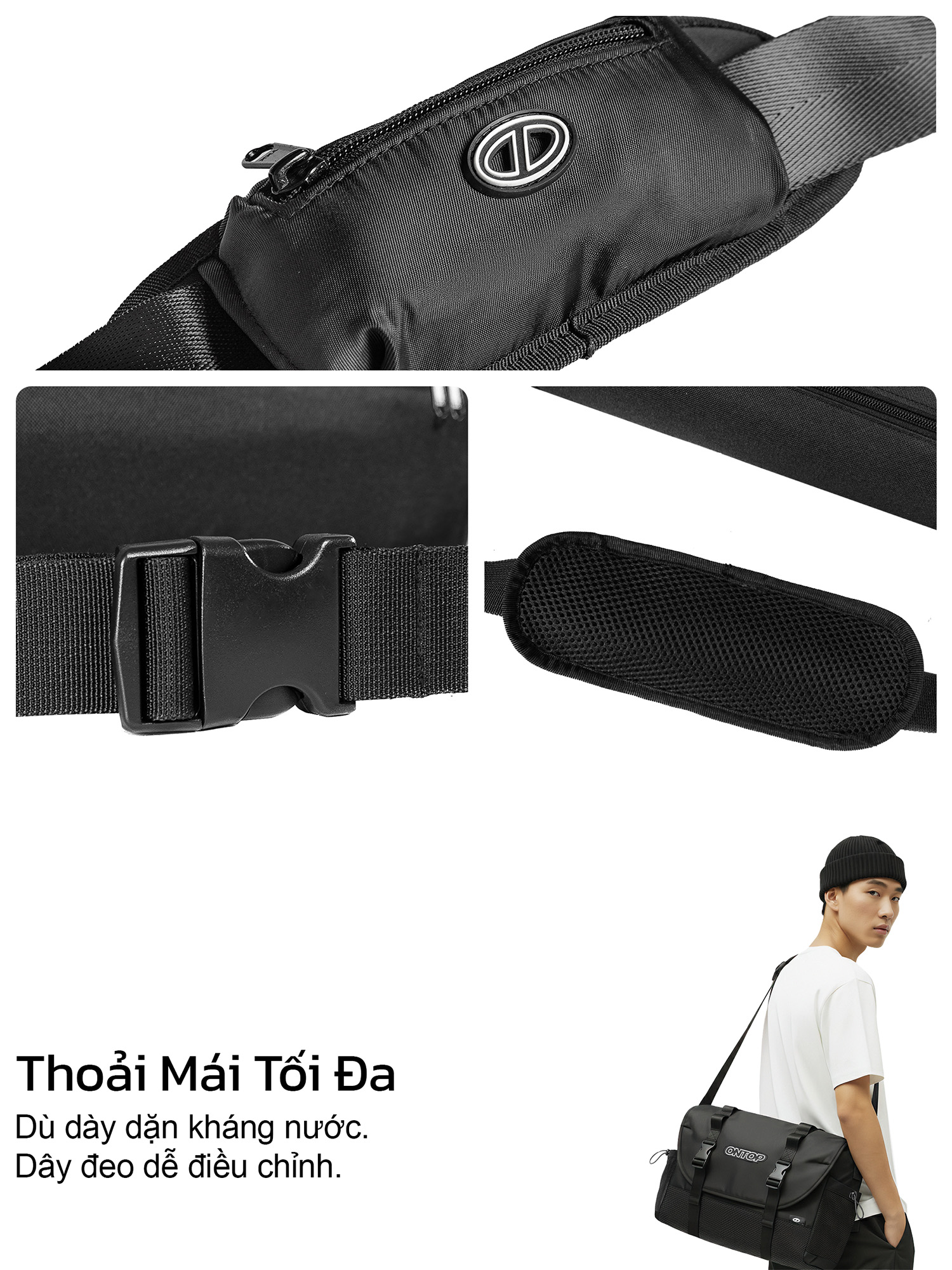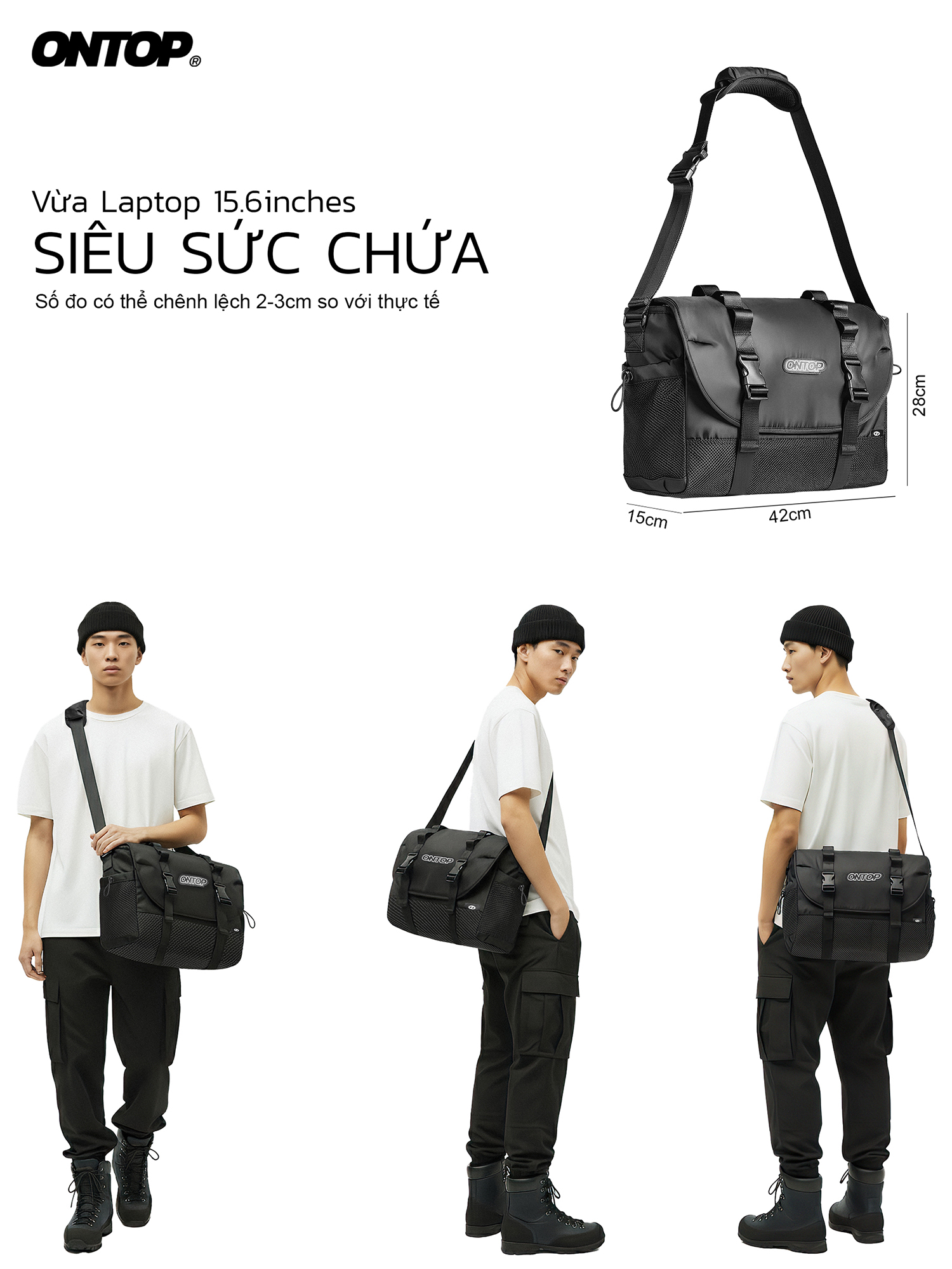 Lớp lót dù và mút xốp bên trong giúp bảo vệ an toàn cho laptop, tài liệu hay phụ kiện cá nhân. Gam màu đen tối giản nhưng đầy cá tính khiến chiếc túi trở nên phù hợp với mọi outfit — từ streetwear, thể thao cho đến phong cách công sở trẻ trung. Đây là dòng túi vừa giữ được chất ONTOP, vừa tối ưu công năng cho những ai thường xuyên di chuyển.