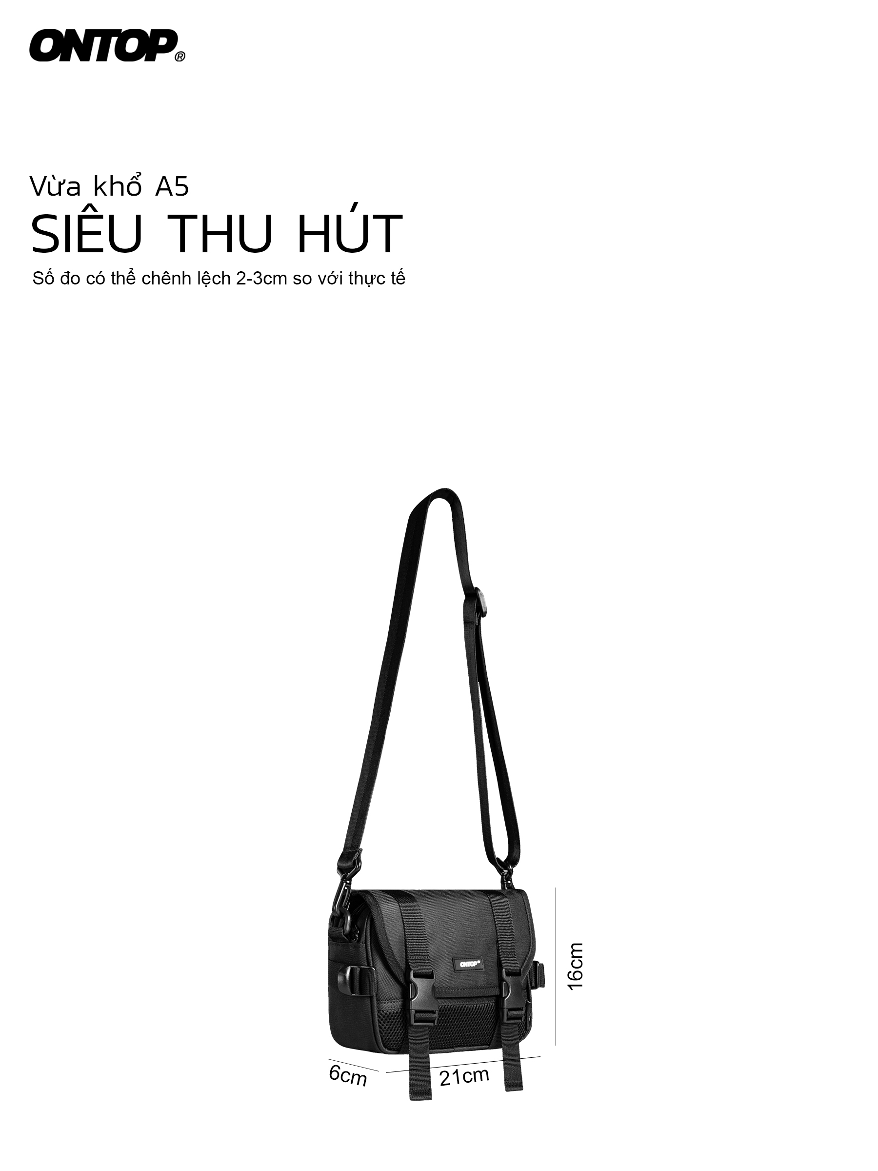 Kiểu dáng dạng hộp basic, kích thước vừa khổ A5 giúp chiếc túi trở nên linh hoạt trong mọi hoàn cảnh, từ dạo phố, đi cà phê đến những chuyến di chuyển ngắn trong ngày. Tổng thể thiết kế hướng đến sự cân bằng giữa công năng và thẩm mỹ, đúng với triết lý khám phá mà ONTOP theo đuổi.