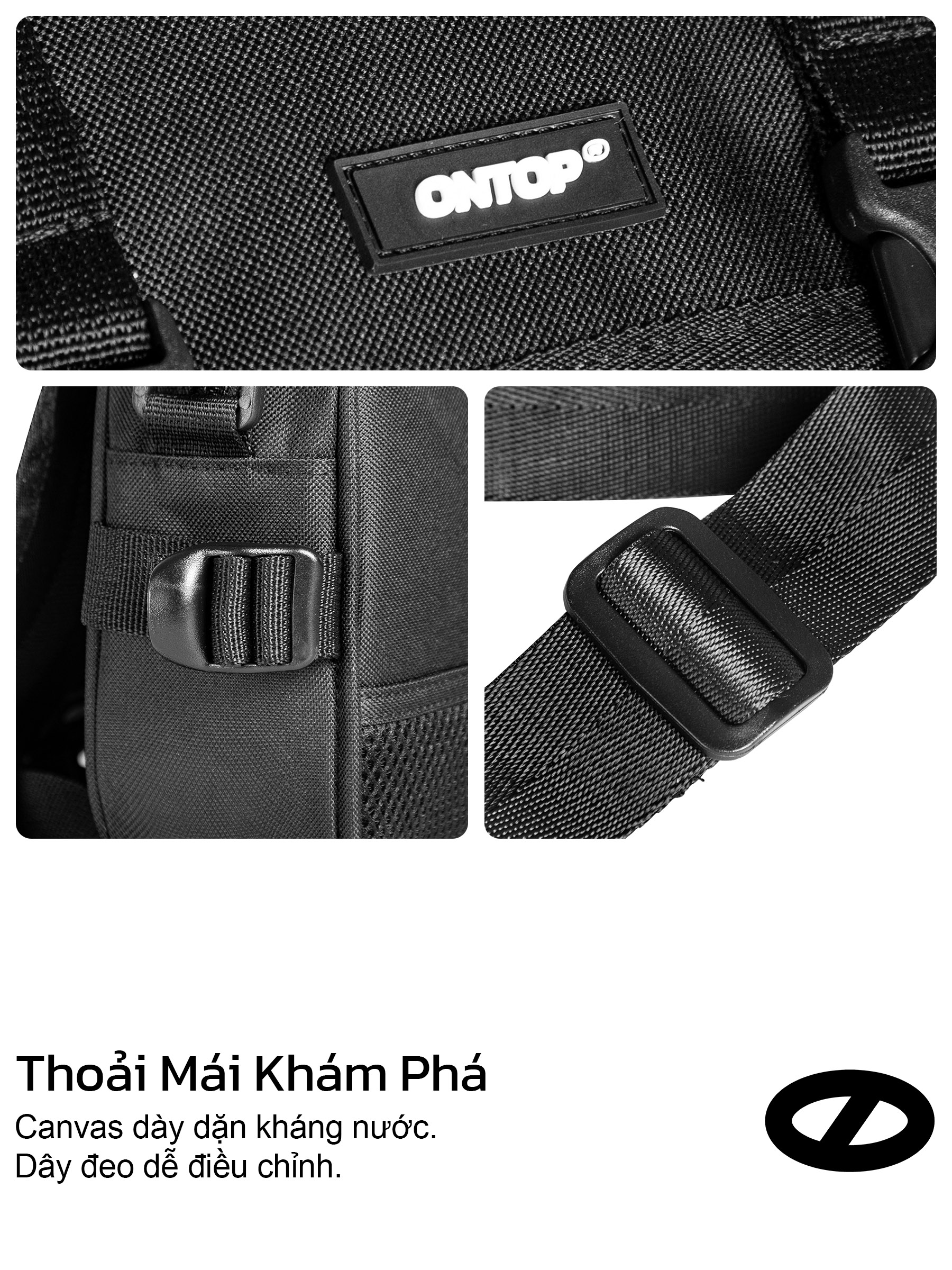 Trên mặt trước của túi, logo su ONTOP được may chắc chắn, vừa đủ nổi bật để tăng nhận diện thương hiệu nhưng không làm mất đi sự cân đối của thiết kế. Tag vải thương hiệu tiếp tục xuất hiện ở góc dưới bên phải túi, tạo sự đồng nhất trong ngôn ngữ thiết kế và khẳng định chất lượng hoàn thiện của sản phẩm.