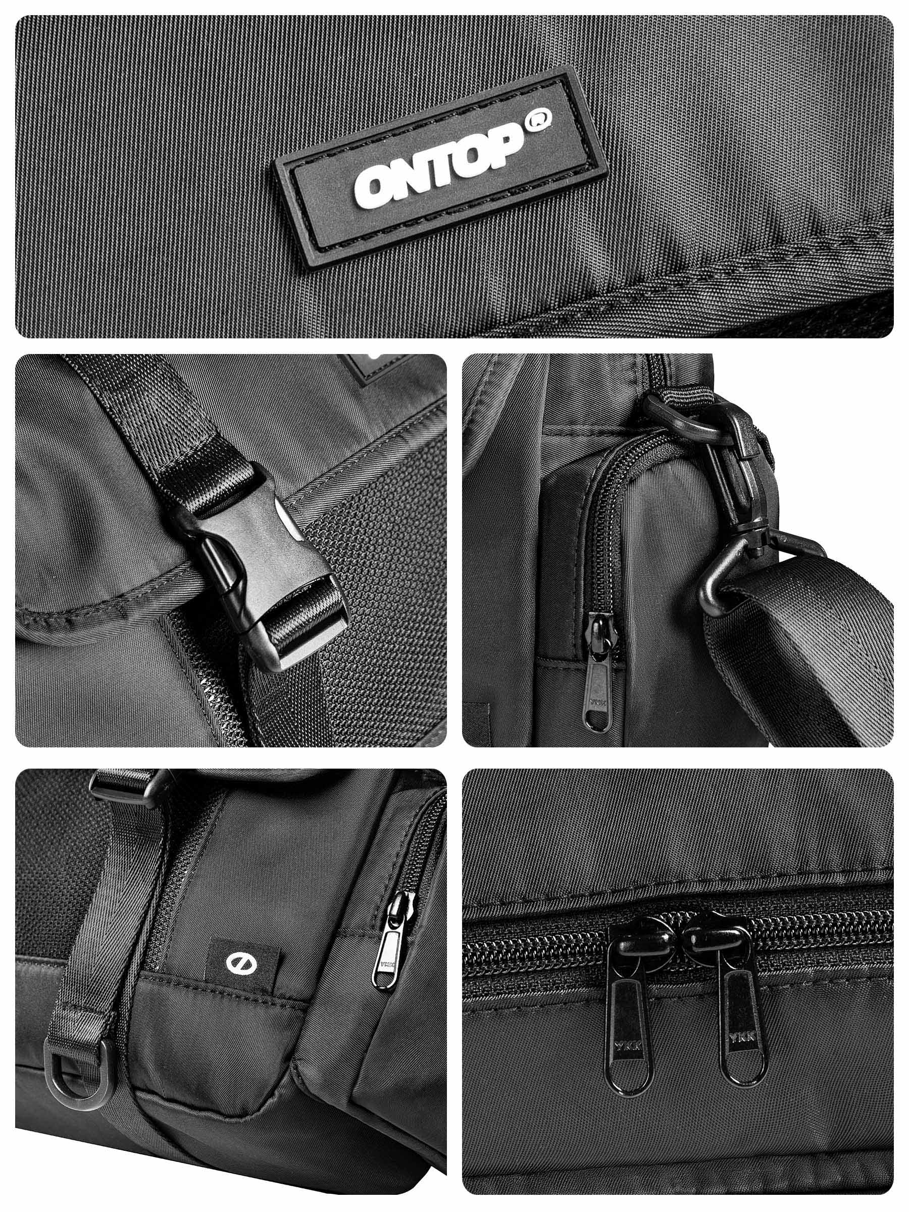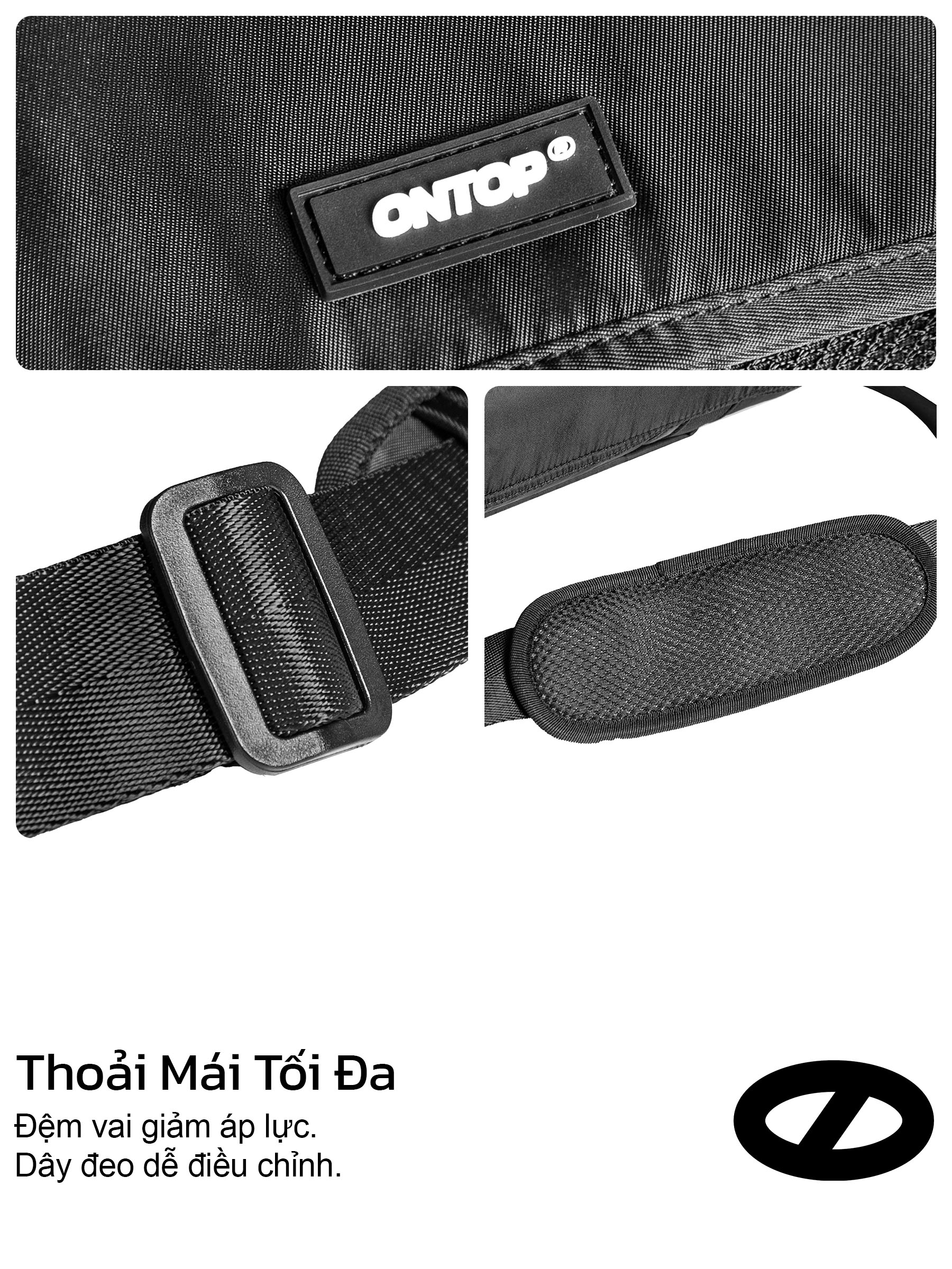 Logo su ONTOP được may nổi chắc chắn ở mặt trước, vừa đủ nổi bật để tăng nhận diện thương hiệu nhưng không gây cảm giác phô trương. Tag vải thương hiệu tiếp tục xuất hiện ở góc dưới bên phải và bên trong túi, tạo sự đồng nhất và chỉn chu trong tổng thể thiết kế.