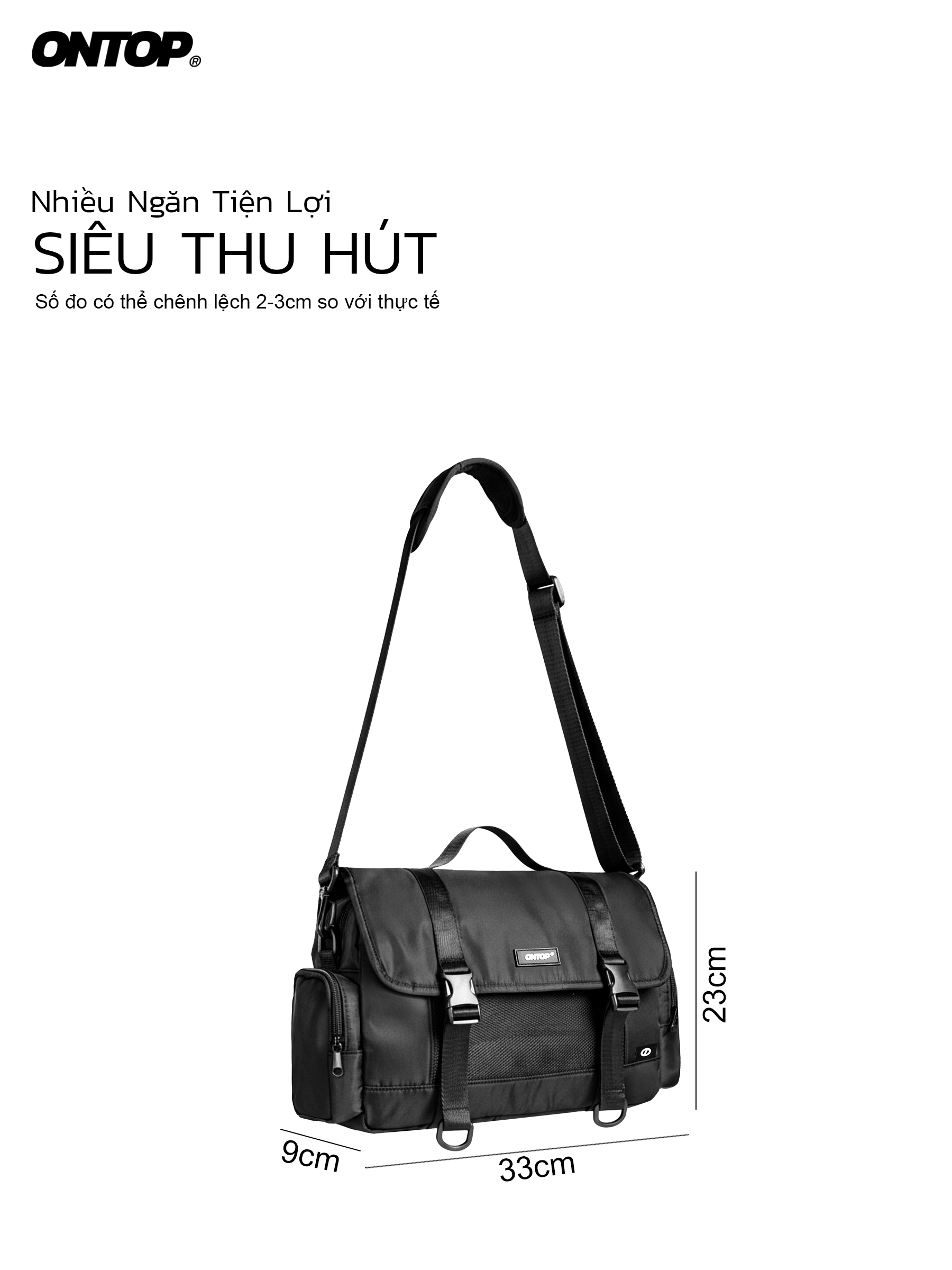 Với kích thước ngang 33cm, dọc 23cm và rộng đáy 9cm, túi đeo chéo vải dù lạnh ONTOP mang đến sự cân bằng lý tưởng giữa khả năng chứa đồ và độ gọn gàng khi đeo. Form túi không quá lớn, không gây cồng kềnh nhưng vẫn đủ không gian cho các vật dụng thiết yếu trong ngày.
